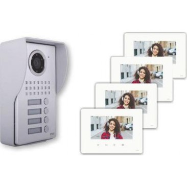 Σύστημα θυροτηλεόρασης 2 καλωδίων της εταιρίας CTC με έγχρωμη οθόνη 7 ιντσών σε λευκό χρώμα, ευρυγώνια κάμερα και αδιάβροχη μπουτονιέρα για επίτοιχη τοποθέτηση. Υποστηρίζει έως 4 εσωτερικές συσκευές ενδοεπικοινωνίας στην ίδια κλήση, ενώ επιπλέον παρέχει την δυνατότητα επέκτασης έως 4 μπουτονιέρες.